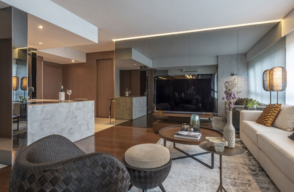 Mirrors are thoughtfully positioned, extending sightlines and amplifying light. Rather than calling attention to themselves, they work subtly widening perspectives and lending the home a calm sense of spatial ease. The result is an interior that feels composed and generous within its scale.
