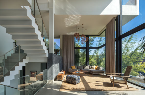 At its heart, light spills through a central void, linking levels in a rhythm of movement and pause. Every turn offers cadence—the living room to the pool, the dining to gardens, the upper floors gazing into the home’s core.