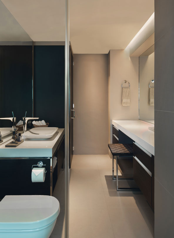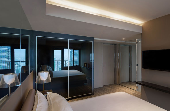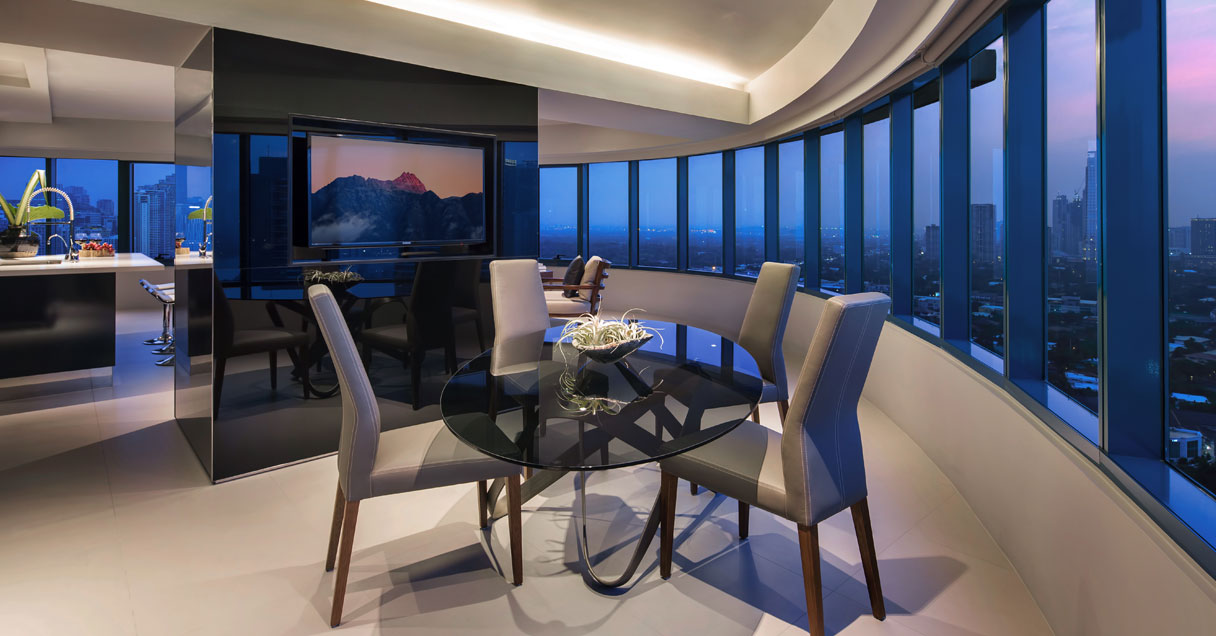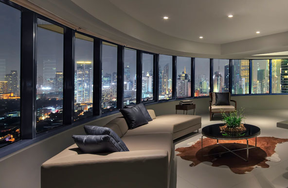 With nearly 180 degrees of panoramic views unfolding beyond the glass, the residence is shaped as a quiet frame to the spectacle of sky and city. Every major space is oriented to receive this expanse, the living room and dining area opening fully to light, movement, and distance. Here, mornings arrive gently, and evenings settle with presence.